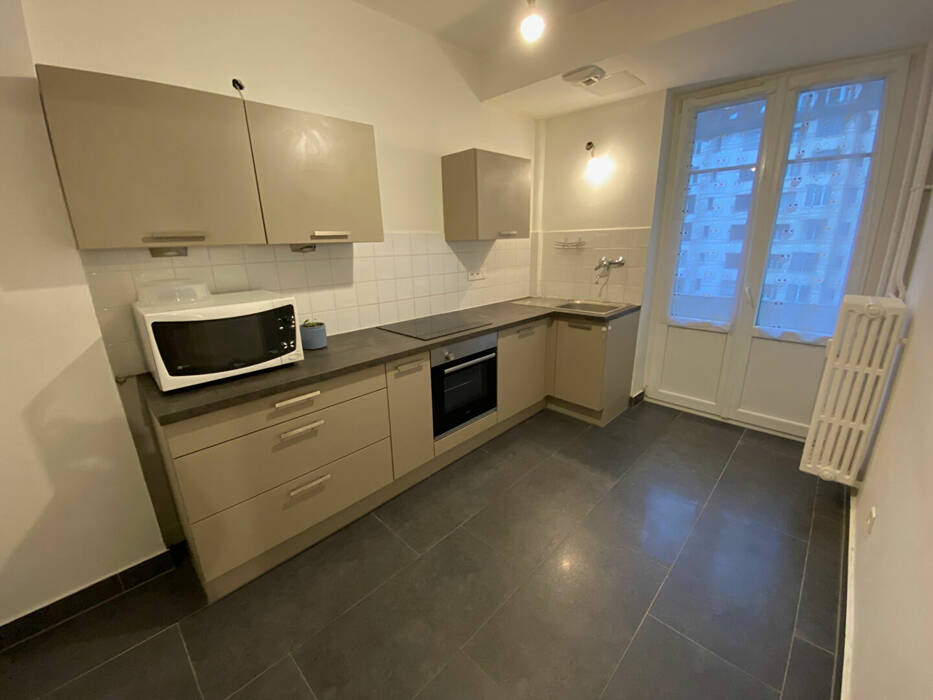 L'appartement se compose de la manière suivante: un grand séjour, une cuisine indépendante équipée (2 plaques, four, micro-ondes, réfrigérateur) donnant sur un balcon, d'une chambre donnant sur un 2e balcon et d'une salle de bains avec WC.