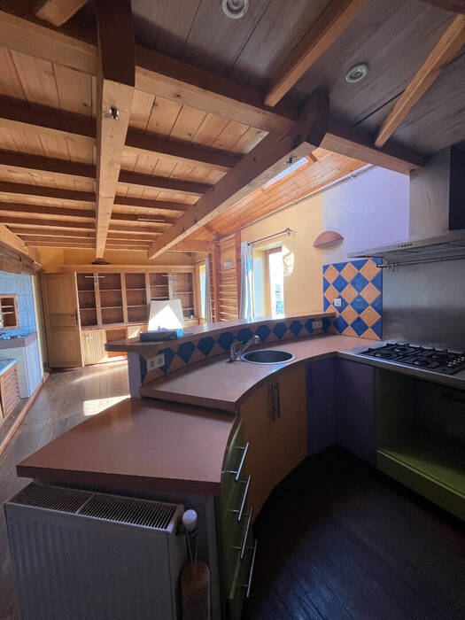 Beau f3 atypique pour amoureux de l'originalité: entrée, espace cuisine équipée ouverte (plaque 4 feux gaz, réfrigérateur et hotte) sur le séjour , nombreux rangements. Une chambre avec salle de douche privative, chambre en mezzanine avec rangements, un WC avec lave mains.