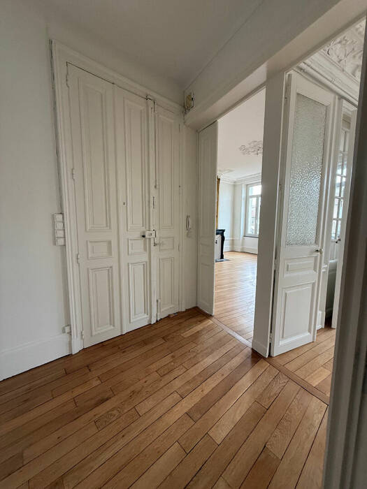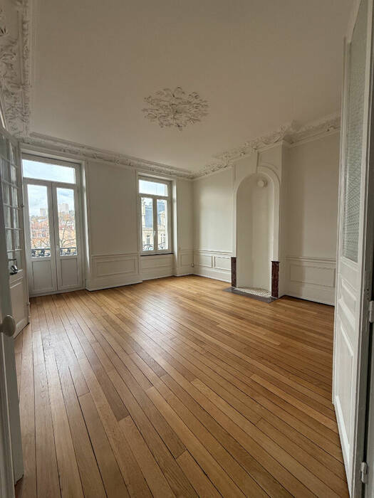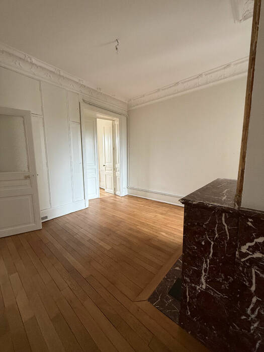 Il se compose d'une entrée spacieuse desservant un vaste double séjour lumineux de plus de 45 m², avec balcon, cheminées décoratives, moulures, et parquet massif d'origine.