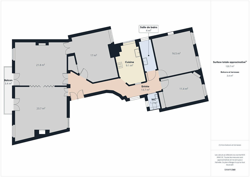 L'appartement comprend également trois grandes chambres (de 12 à 18 m²), une salle de bains, et un WC indépendant.