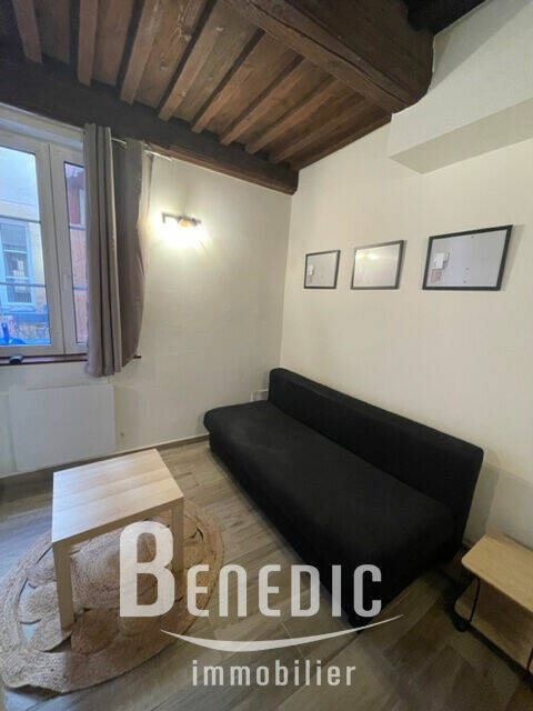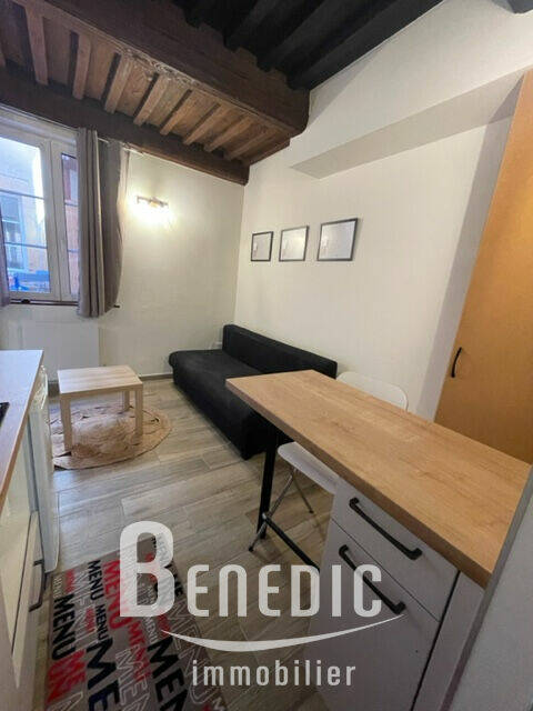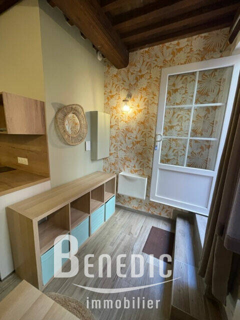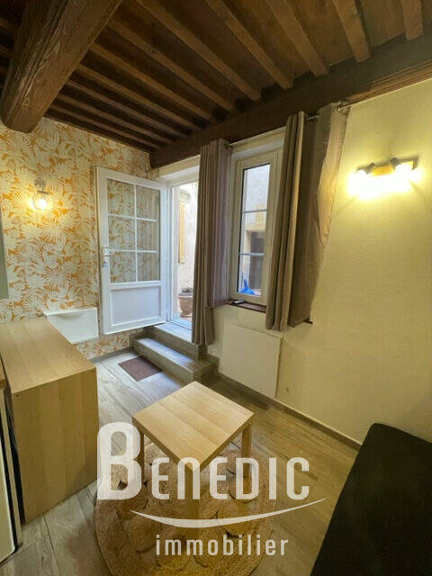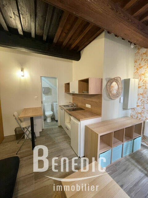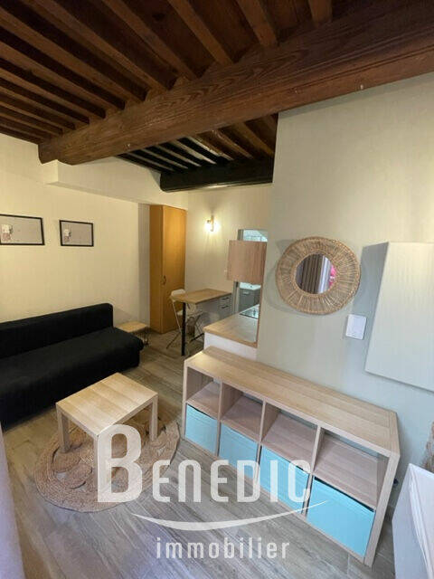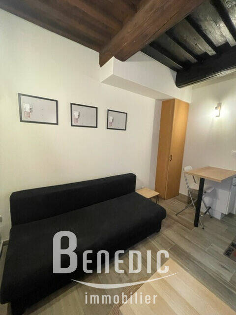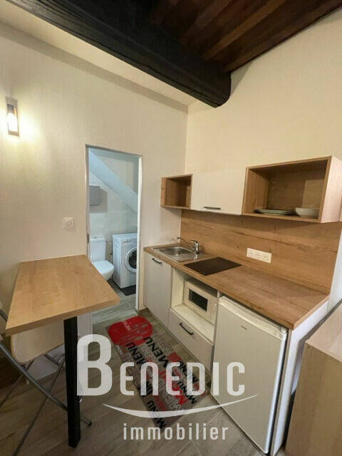 Dans un immeuble ancien, un studio équipé en RDC sur cour arrière : une pièce principale avec cuisine ouverte équipée, une salle de bain avec WC et dégagement.