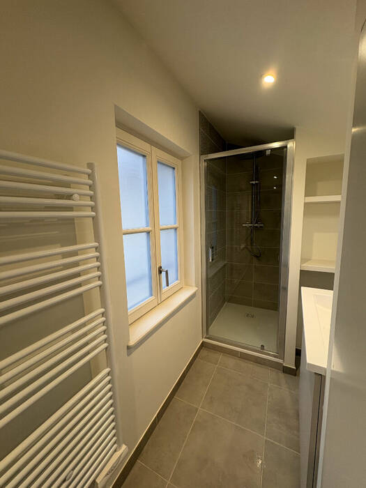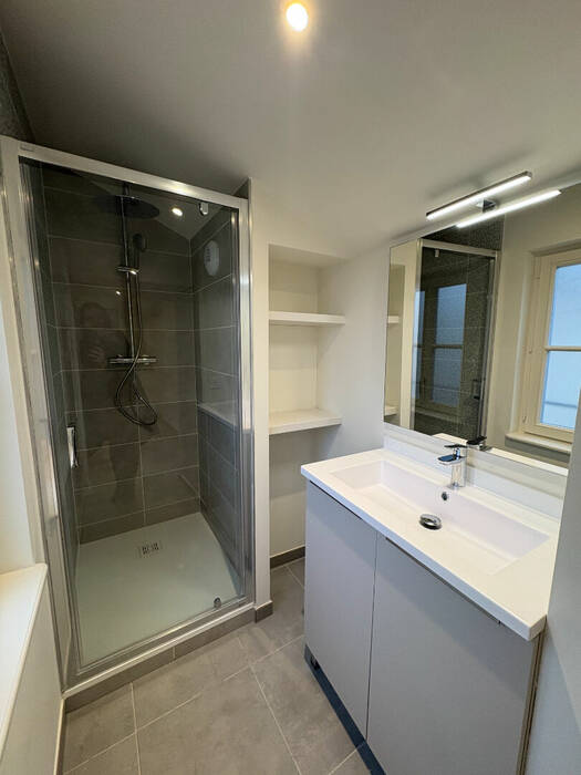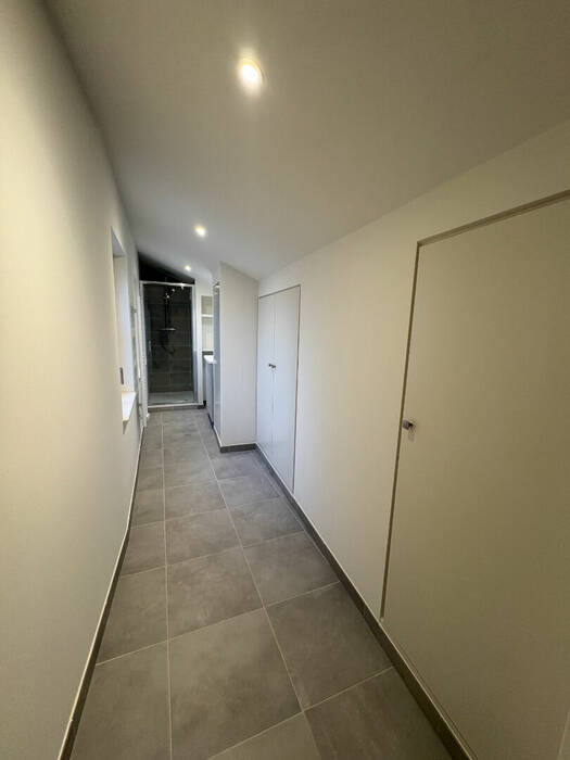 Pièce de vie lumineuse avec cuisine équipée ouverte, chambre spacieuse, salle de bain avec douche. WC séparé avec lave-mains