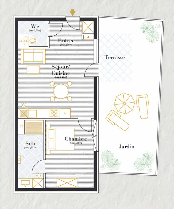 F2 avec Entrée individuelle, jardin et terrasse privatifs.
