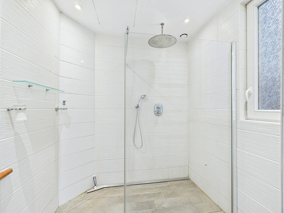 la salle de douche est moderne et est séparée des WC.