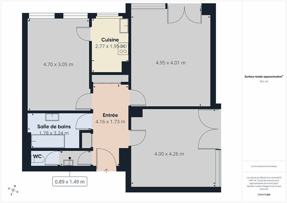 D'une surface de 73m2, Il se compose d'une entrée avec placard, une cuisine, un séjour, deux chambres, une salle de bain avec WC séparé