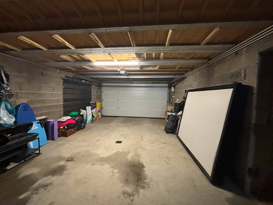 Elle dispose d'un sous-sol complet avec garage et buanderie, offrant de nombreux espaces de rangement.