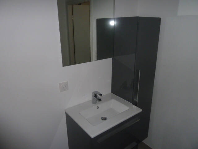 La salle de douche est carrelée toute hauteur, elle est moderne et possède une vasque équipée.