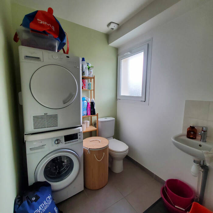 Au rez-de-chaussée : une entrée avec placard, une buanderie avec WC, séjour avec une cuisine ouverte semi équipée (hotte, plaque de cuisson et éléments de rangement) donnant accès au jardin.