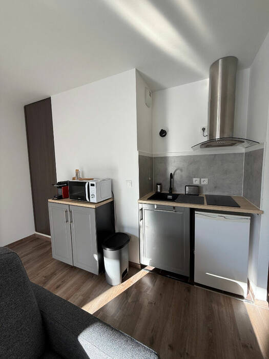 Situé au rez-de-chaussée surélevé, il se compose d'une pièce de vie lumineuse avec canapé convertible, table, rangements et coin bureau, d'un espace cuisine entièrement équipé (plaques, hotte, micro-ondes, réfrigérateur), ainsi que d'une salle d'eau moderne avec douche, WC et lave-linge.