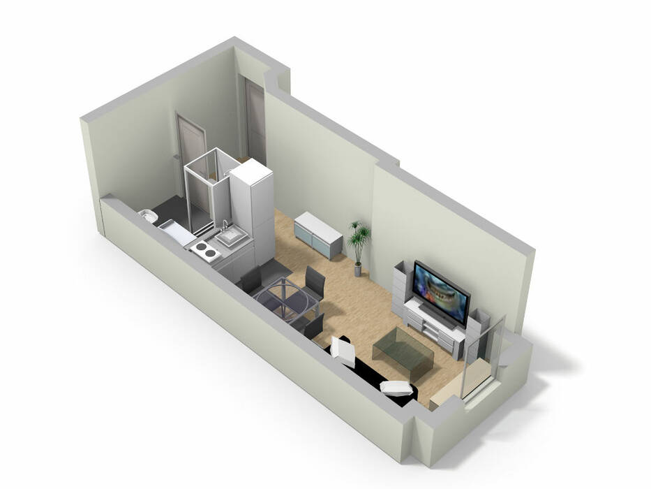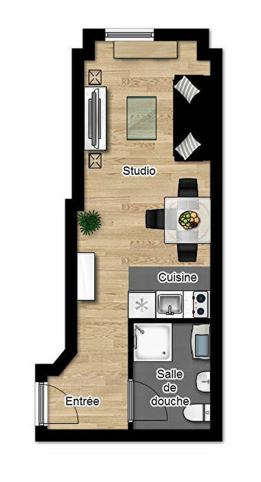 Pièce principale lumineuse et bien agencée avec coin cuisine