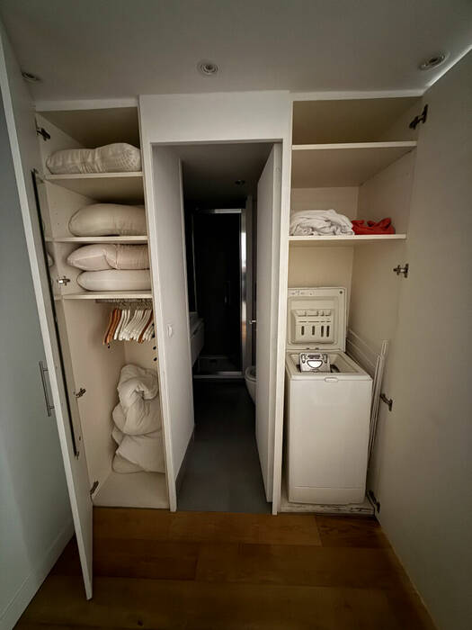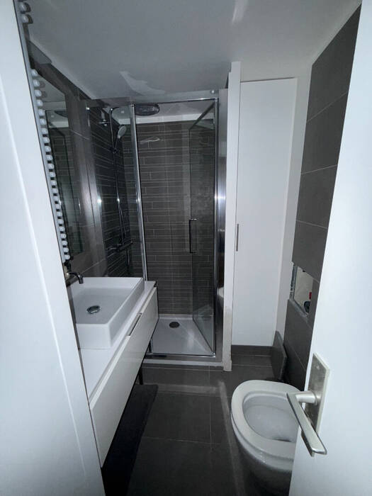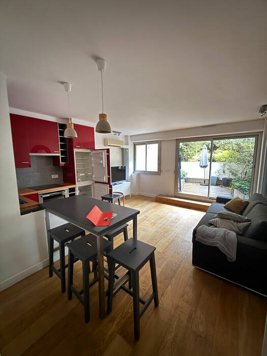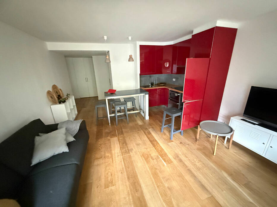 Un studio meublé, situé au 1er étage d'un immeuble avec ascenseur, composé d'une entrée, d'une pièce à vivre avec une cuisine ouverte, d'une salle d'eau avec WC, et d'une grande terrasse.