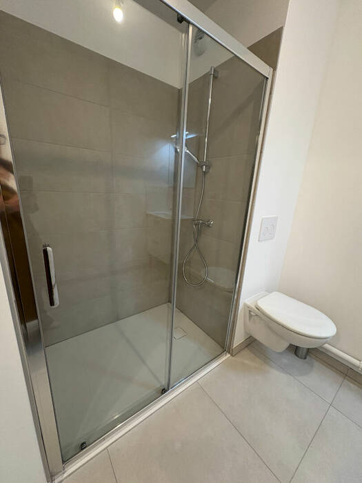 La salle de douche moderne est équipée d'une vasque et d'un WC.