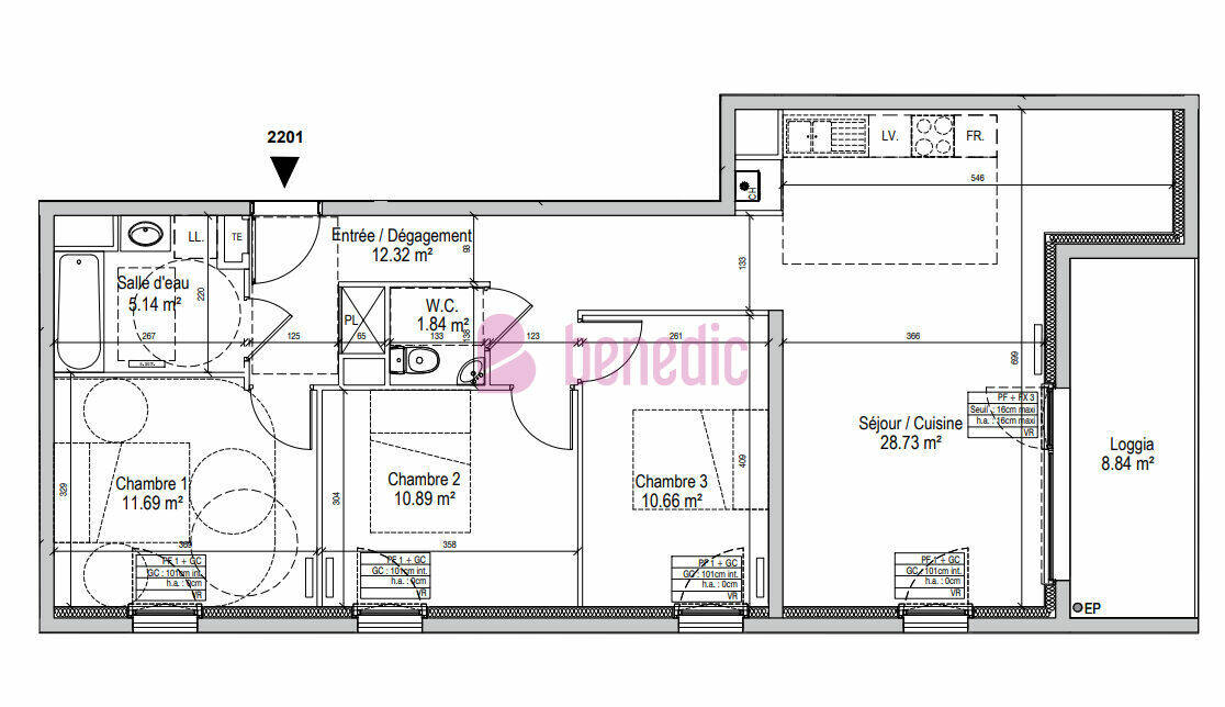 Le séjour/cuisine de 28,73 m² constitue un véritable espace de vie, lumineux et convivial, prolongé par une loggia de 8,84 m² offrant un agréable extérieur utilisable en toute saison. L'appartement dispose de trois chambres, d'une salle d'eau fonctionnelle, d'un WC indépendant et d'un dégagement spacieux facilitant l'organisation du quotidien.