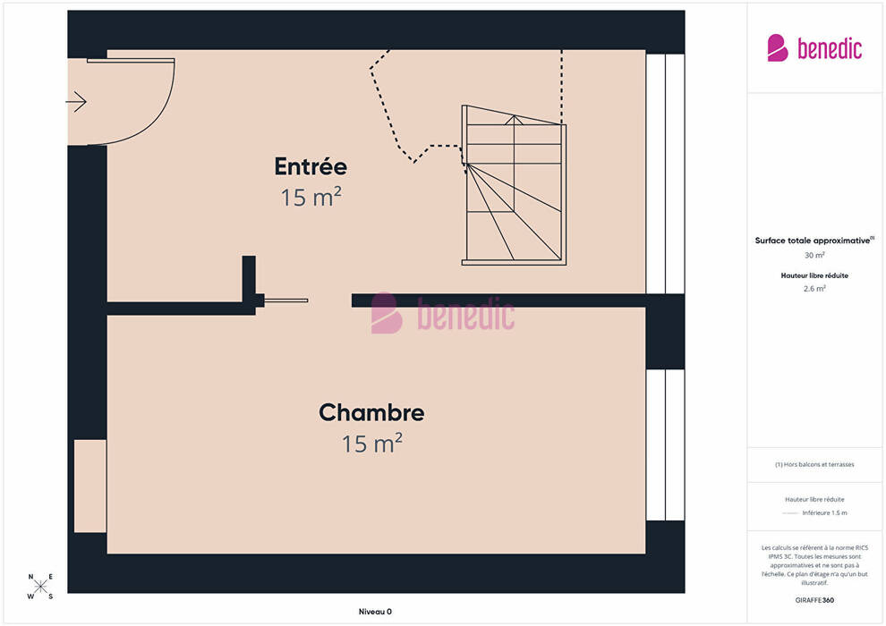 Composé d'une entrée avec un escalier qui vous permettra d'accéder à l'étage et une grande chambre de 28 m².