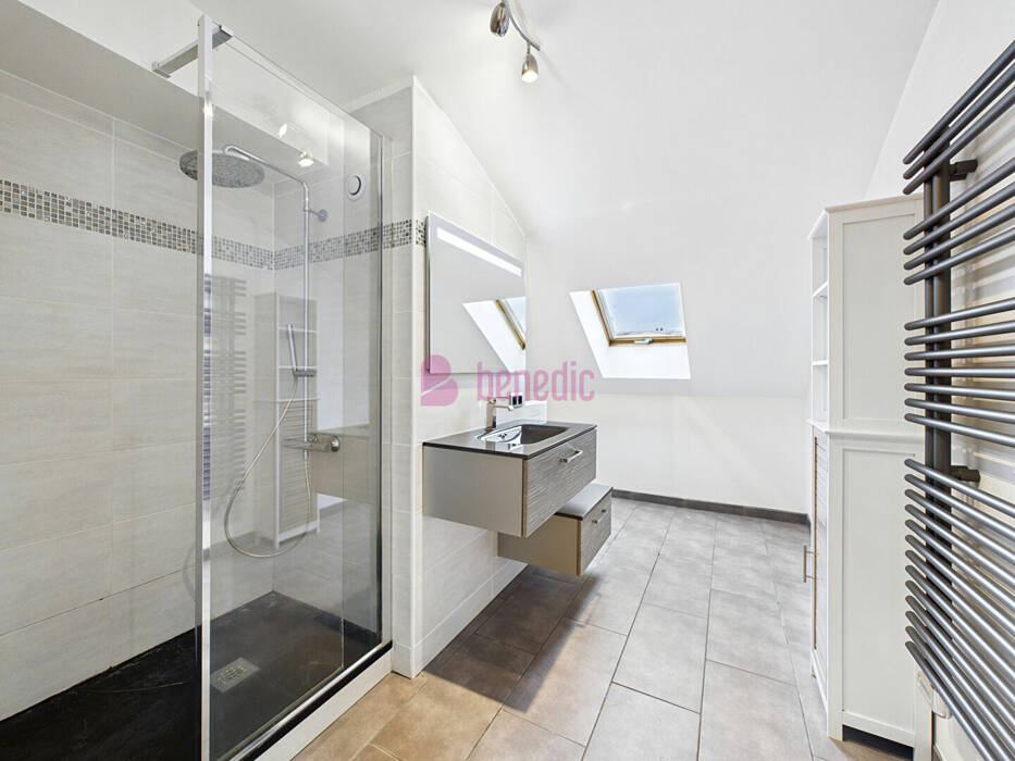 A l'étage, un palier desservant une salle d'eau contemporaine avec WC et deux grandes chambres disposant de placard ou dressing.