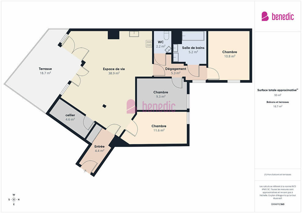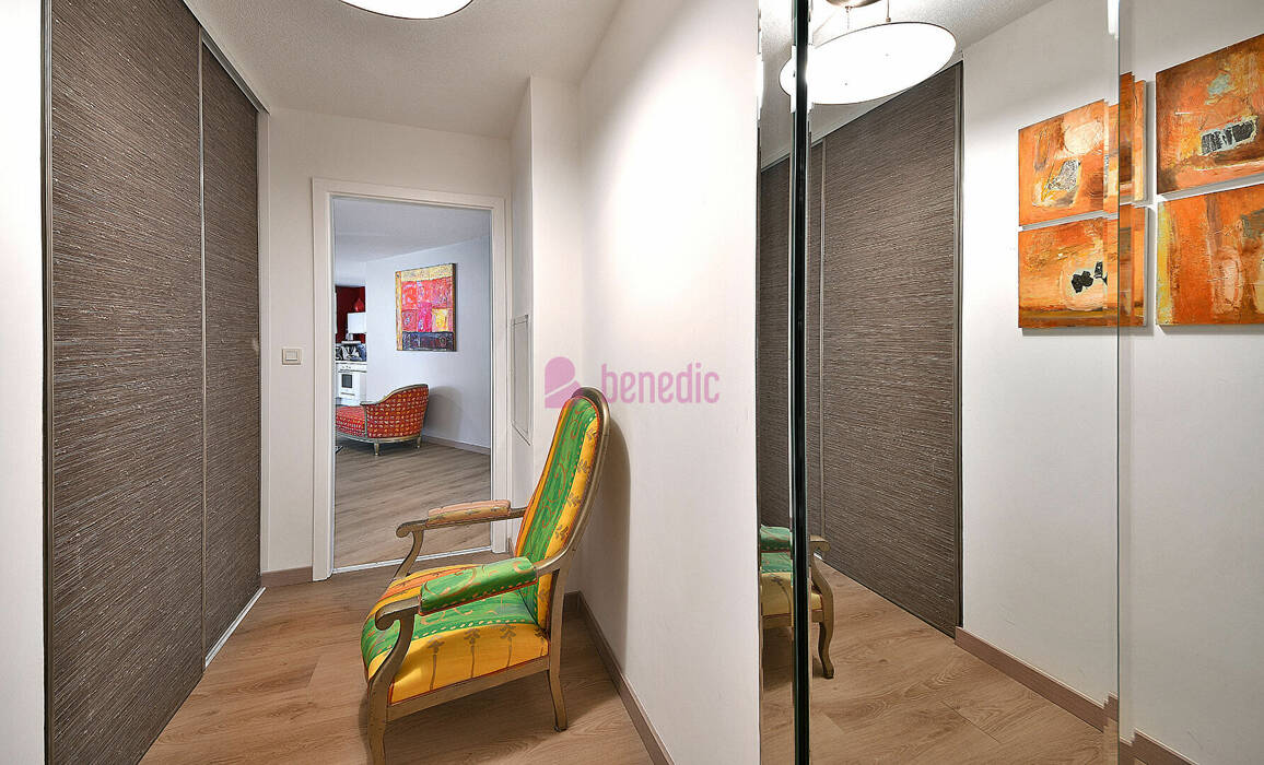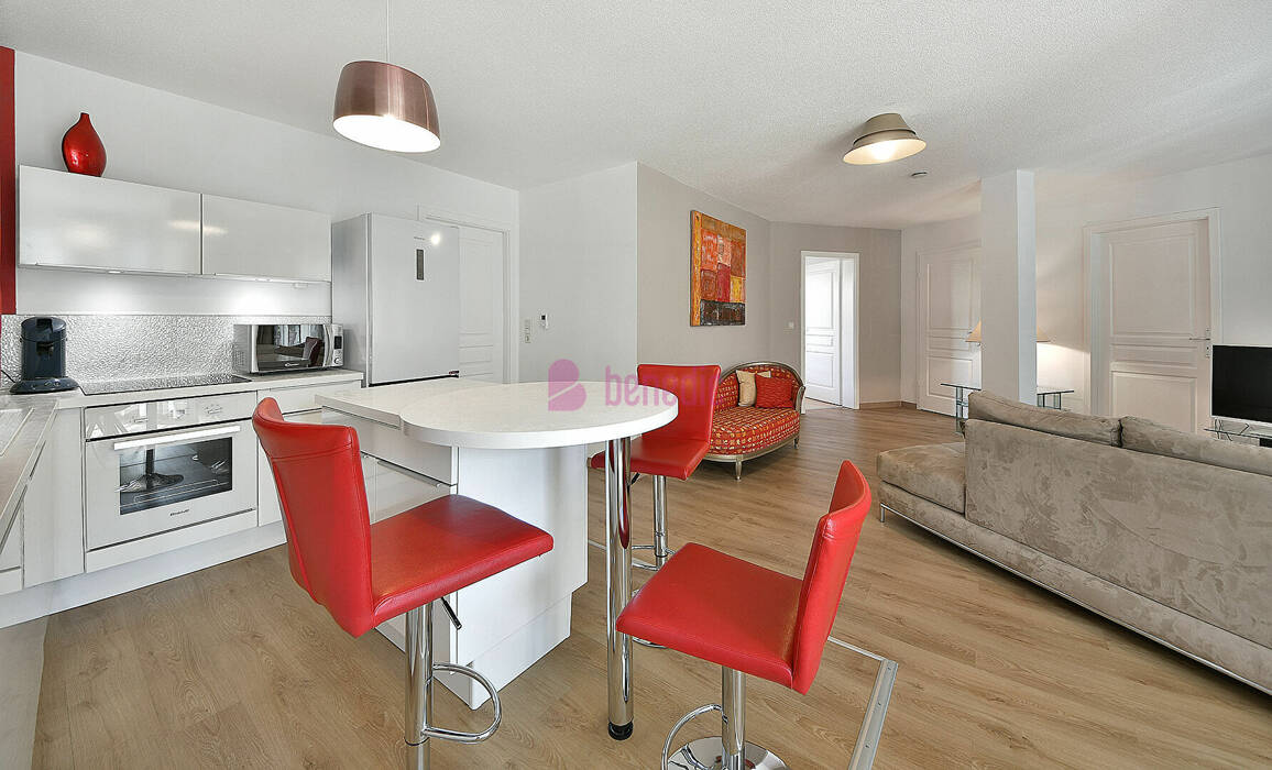 L'appartement offre une agréable pièce de vie lumineuse exposée plein sud, avec cuisine équipée ouverte sur le séjour, créant un espace convivial et fonctionnel. Cet espace s'ouvre directement sur une spacieuse terrasse de 18,50 m², idéale pour profiter des beaux jours.