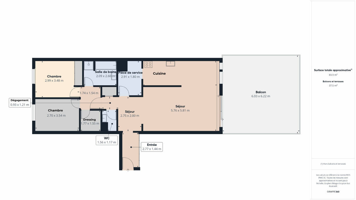 L'appartement vous propose un agencement idéal : une vaste entrée avec rangements, une pièce de vie lumineuse de 45 m² avec cuisine équipée et cellier, deux chambres, un WC avec lave-mains, une salle de bains/douche et un dressing.