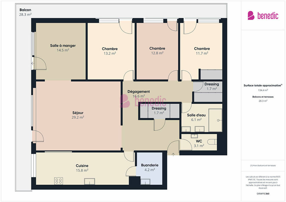 Au troisième et dernier étage avec ascenseur, cet appartement de six pièces est composé d'une entrée, un wc avec lave mains, un salon-séjour de plus de 45m², une cuisine équipée avec un spacieux espace garde manger/buanderie, un dégagement, trois chambres, deux dressings et une salle de douche.