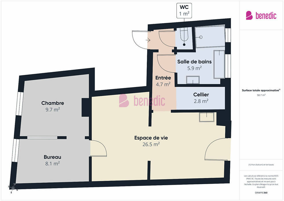 Il se compose d'une entrée, de WC séparés, d'une salle d'eau, d'un espace buanderie, d'une cuisine dinatoire, d'un séjour, d'un bureau (ou dressing) et d'une chambre.