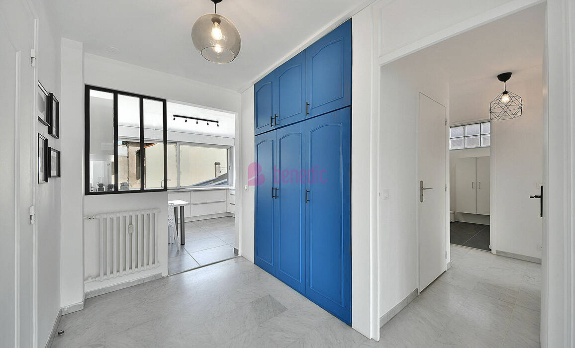Au 3ème étage (sur 4) d'une copropriété de standing datant de 1968, un appartement de type 4 pièces comprenant une entrée avec placard, une belle pièce de réception avec accès à une loggia, une cuisine équipée avec cellier-buanderie, un dégagement, un WC, une salle d'eau et deux belles chambres.