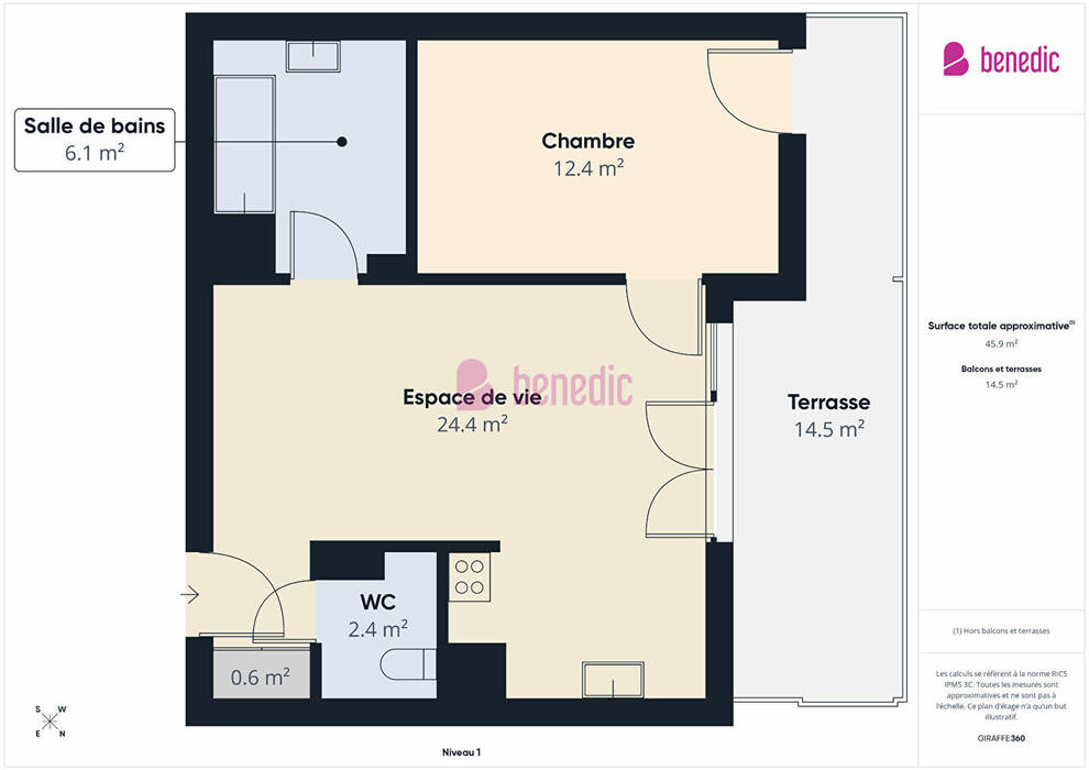 Surface totale: 45 m²