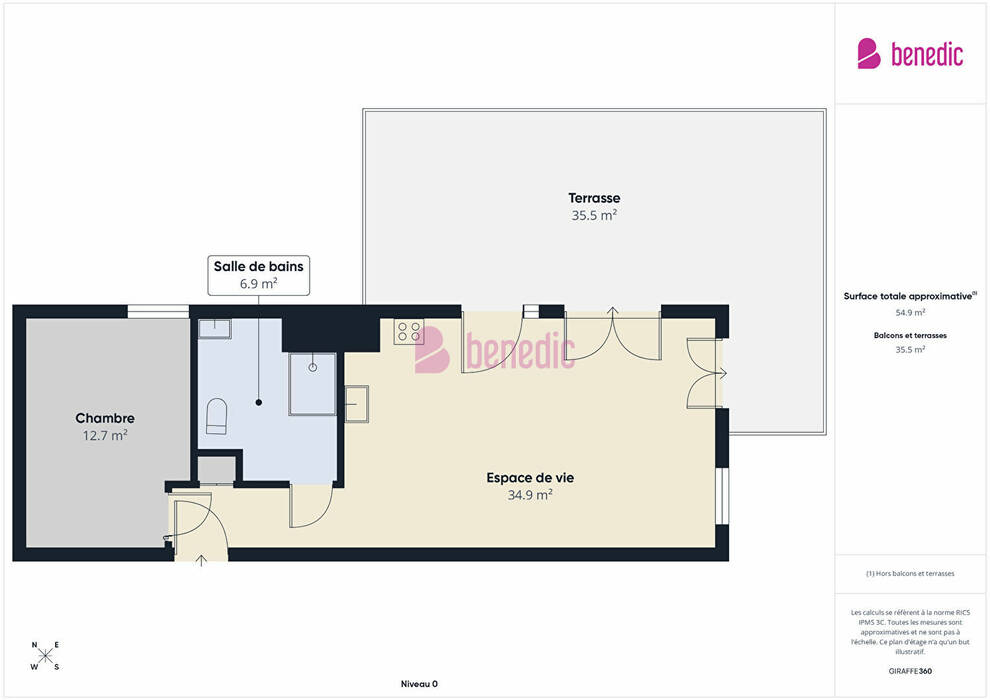 L'appartement se compose : d'une pièce à vivre d'environ 30m² très lumineuse avec cuisine équipée ouvrant sur terrasse exceptionnelle de 38m² bien exposée et vue dégagée, une chambre de 12m², entrée et salle de bains.