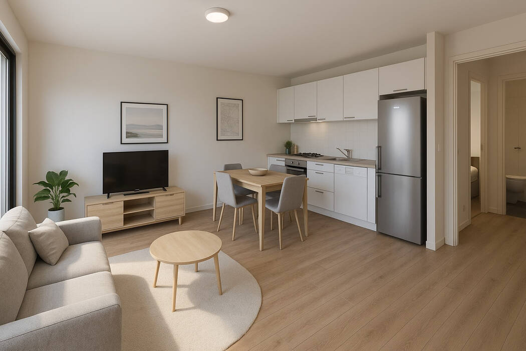 Les appartements T2, disposent d'un séjour lumineux prolongé par une cuisine ouverte, d'une chambre séparée ainsi que d'une salle d'eau moderne. Chaque T2 bénéficie d'un balcon, permettant de profiter pleinement de l'extérieur.