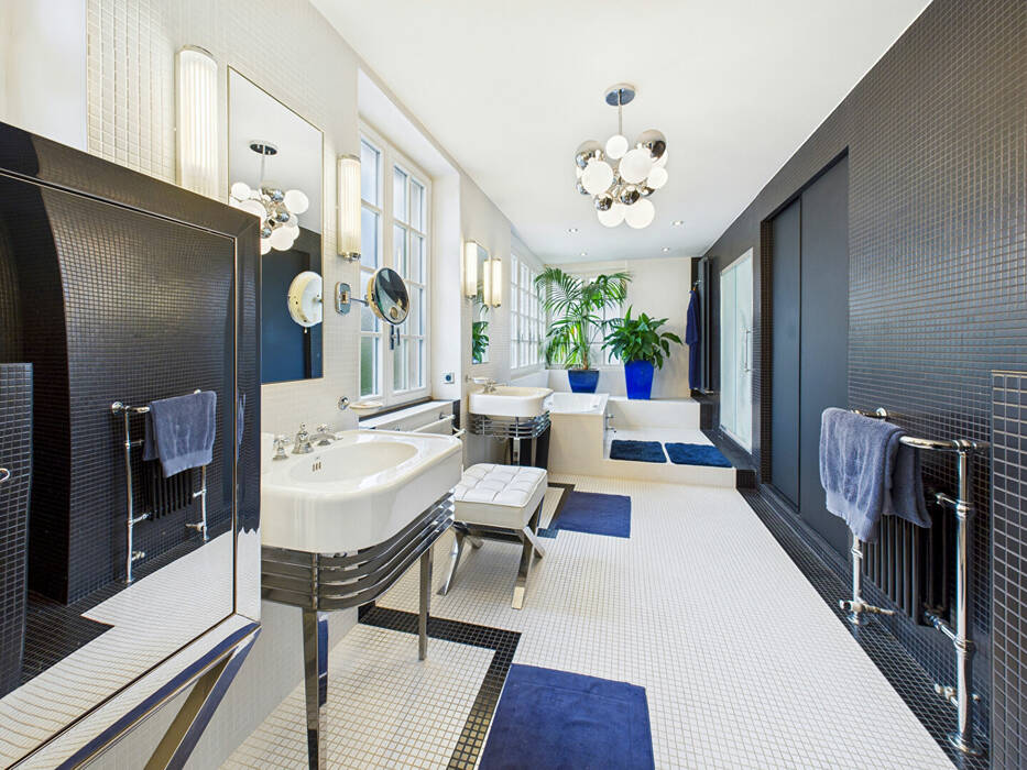 Une salle de bains haut de gamme (douche à l'italienne, baignoire, double lavabo et WC), conçue avec de très beaux matériaux.