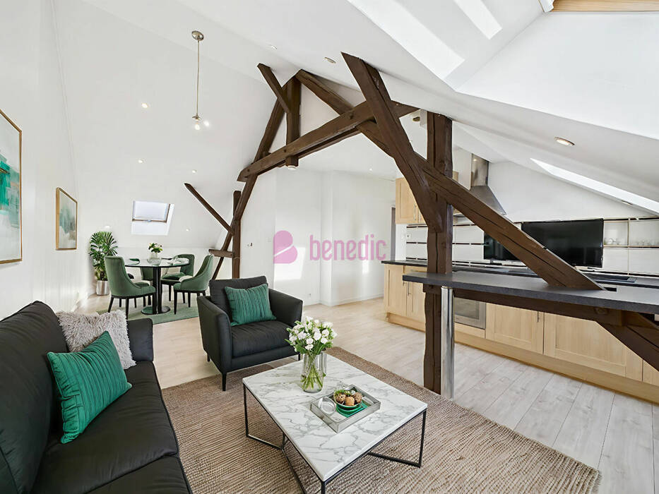 Situé au 20 de la recherchée rue de la Victoire, en dernier étage d'un bel immeuble bourgeois des années 30, un appartement 3 pièces mansardé d'environ 65m² au sol.