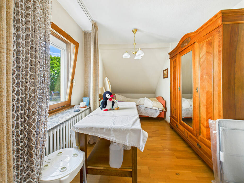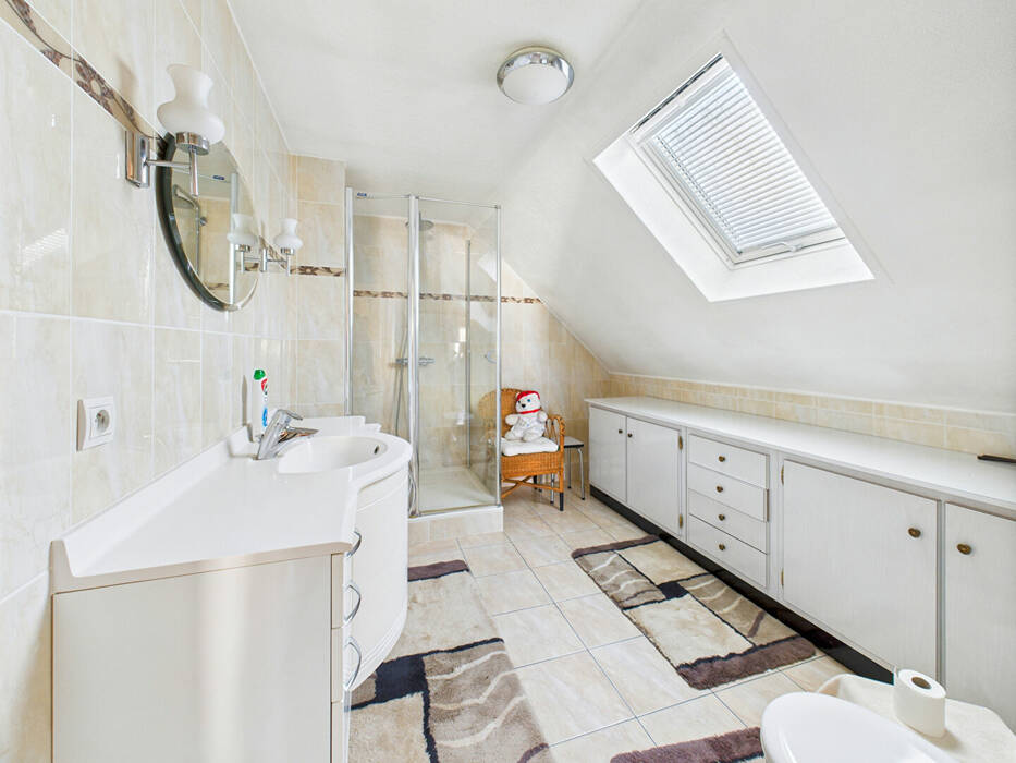- Au 1er étage, un dégagement dessert 2 chambres, dont une chambre avec un espace bureau, et une grande salle de bain avec Wc.