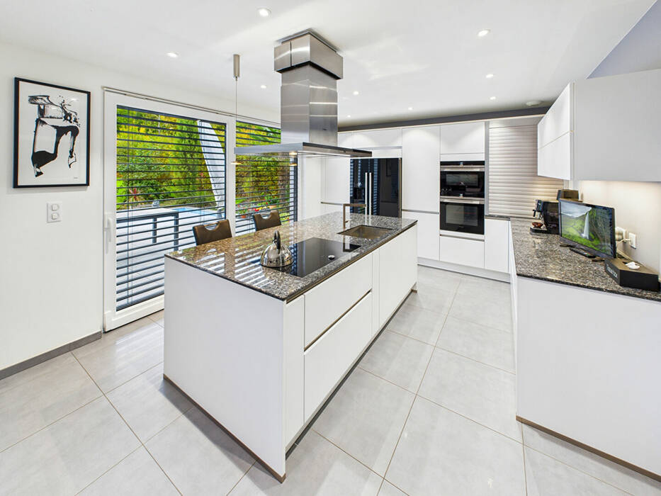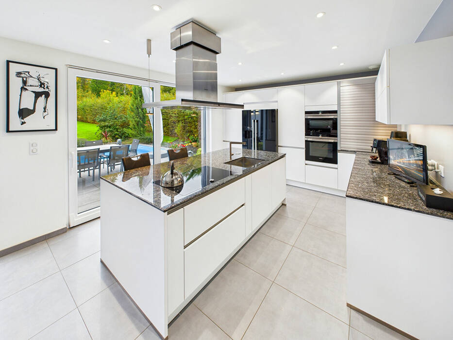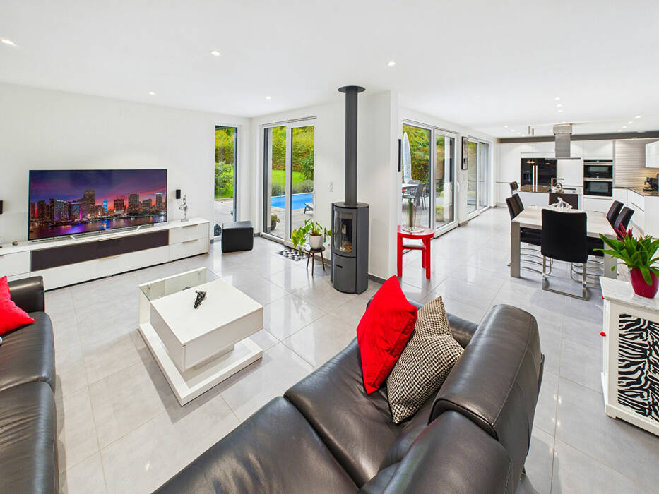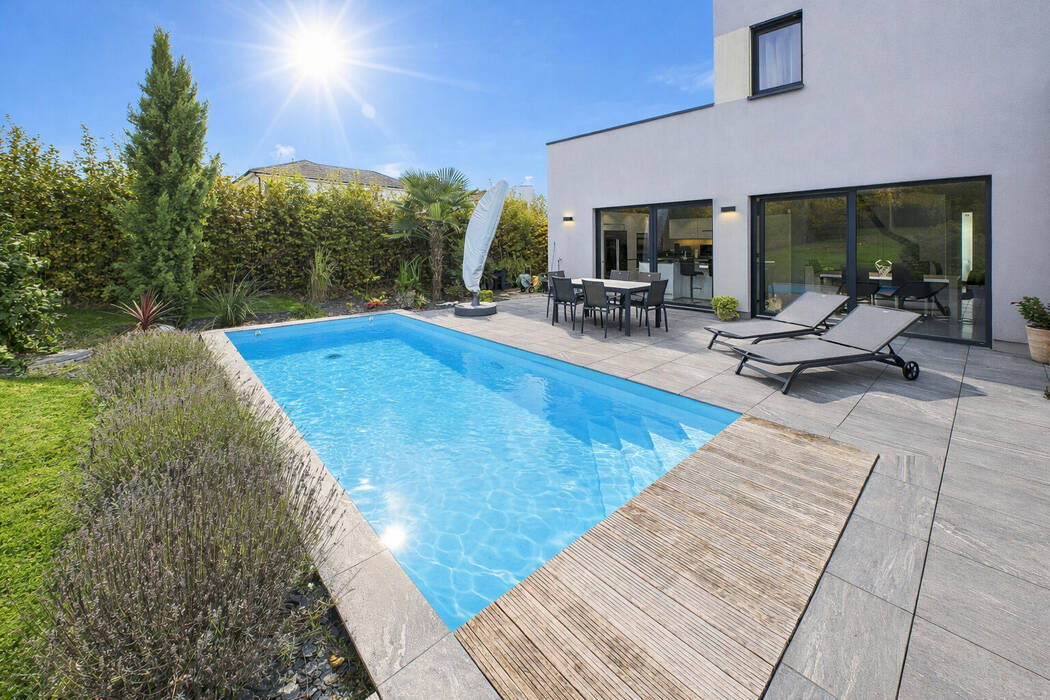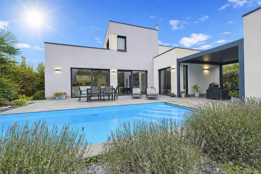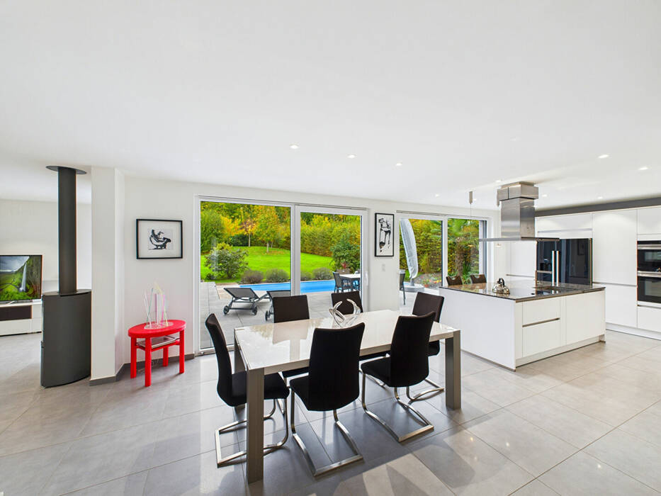 De superbes baies vitrées prolongent naturellement les pièces de réception vers l'extérieur et invitent à profiter d'une vaste terrasse avec piscine chauffée, offrant une perspective apaisante sur un jardin paysager parfaitement entretenu.