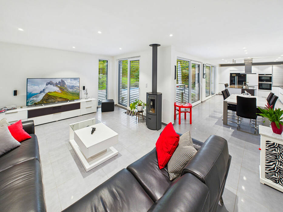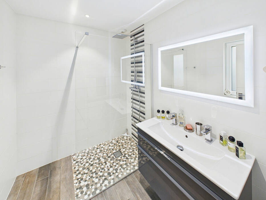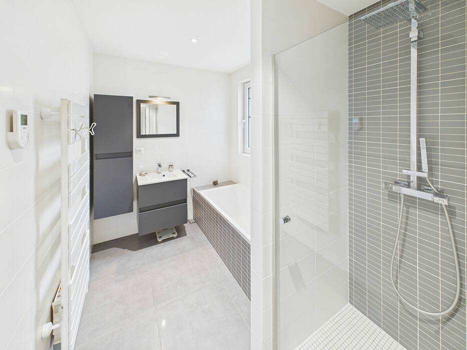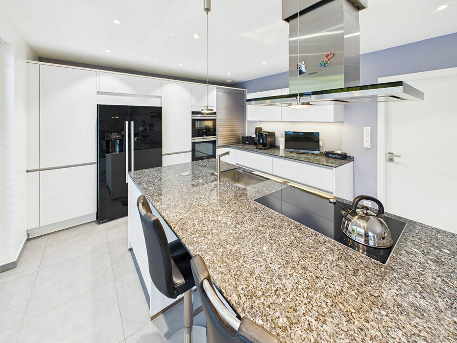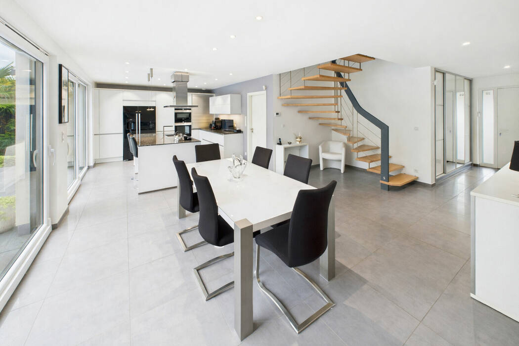 Dès l'entrée, le ton est donné : un hall accueillant avec vestiaire et toilettes invités dessert les espaces de réception. Le rez-de-chaussée dévoile un magnifique espace de vie ouvert, composé d'un salon, d'un séjour et d'une cuisine américaine haut de gamme entièrement équipée, le tout pensé comme un véritable lieu de convivialité et de partage.