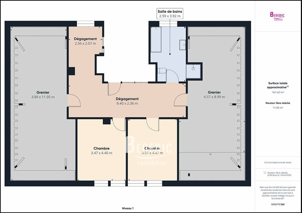 - A l'étage : un dégagement, deux chambres, une salle de bains, deux greniers