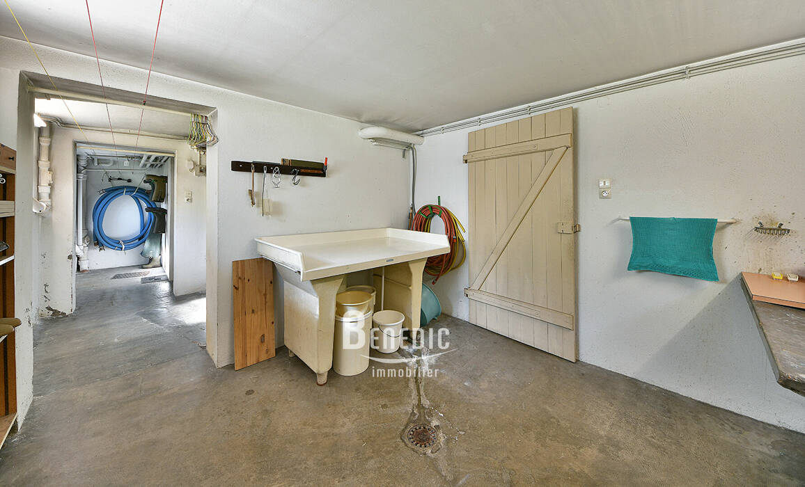 - Un sous-sol complet comprenant : atelier, buanderie-chaufferie, une cave, plusieurs espaces de stockage, un garage double en enfilade.