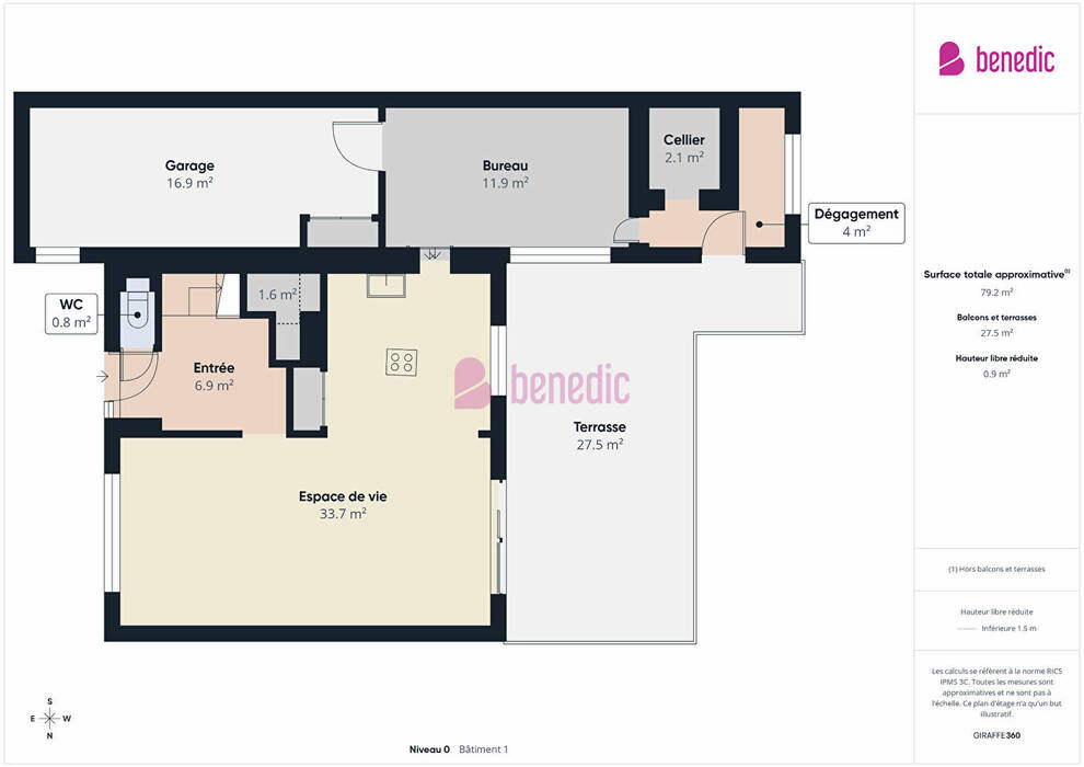 Pièce de vie: 32 m²