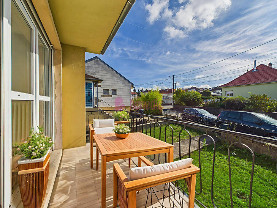 Maison mitoyenne d'un côté comprenant une entrée, une cuisine équipée, un séjour double accès à un balcon, un dégagement, deux chambres, un WC et une salle d'eau.