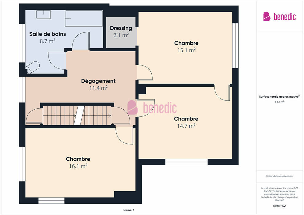 A l'étage : un dégagement, trois chambres dont une avec dressing et une salle de bains avec WC.