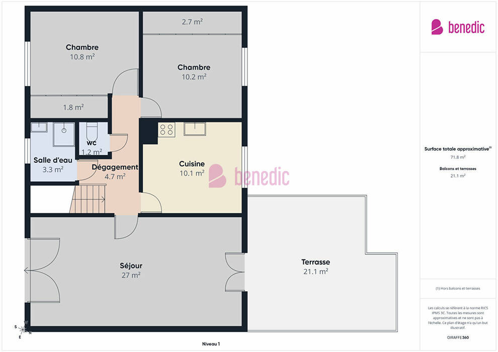 Vous profiterez d'une cuisine indépendante équipée, ainsi que d'un salon-séjour lumineux donnant un accès direct à la terrasse et à un agréable jardin, parfait pour les moments de détente en extérieur.