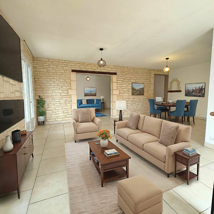 Dès que vous franchissez le seuil, vous serez séduit par son double séjour généreux, ouvert sur la cuisine, formant un espace de vie convivial et lumineux, idéal pour partager des moments privilégiés en famille ou entre amis.