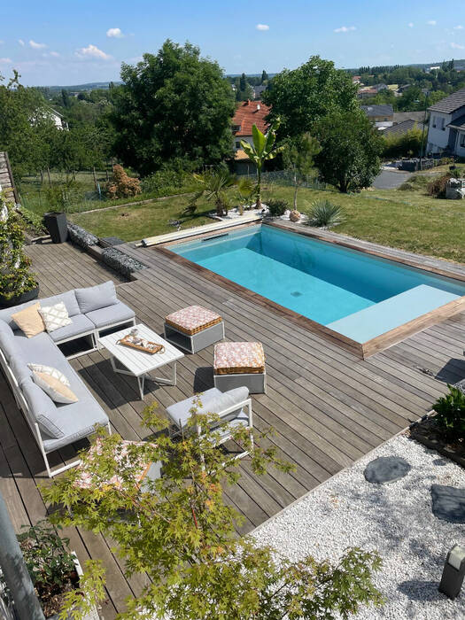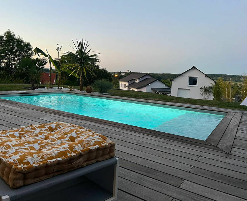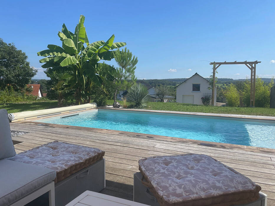 A l'extérieur, les prestations sont particulièrement soignées : le terrain entièrement clos et paysager accueille une piscine chauffée par pompe à chaleur, créant un véritable espace de détente dans un environnement verdoyant.