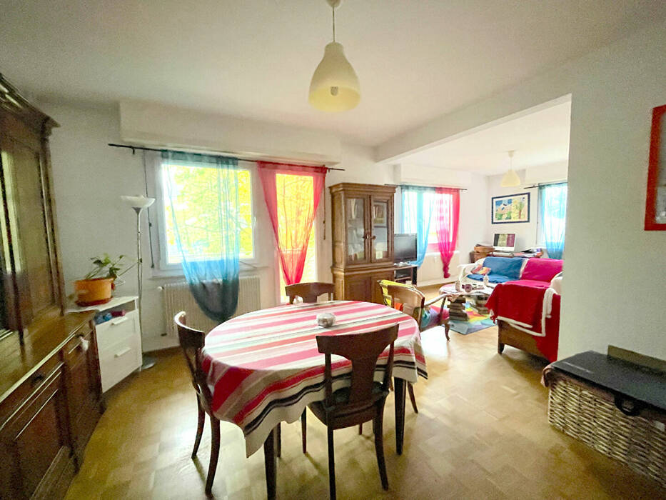 Entrée donnant accès à un vaste salon séjour lumineux de 31 m2 avec parquet au sol, une cuisine aménagée, deux chambres, une salle de bains, Un cabinet de toilettes indépendant.