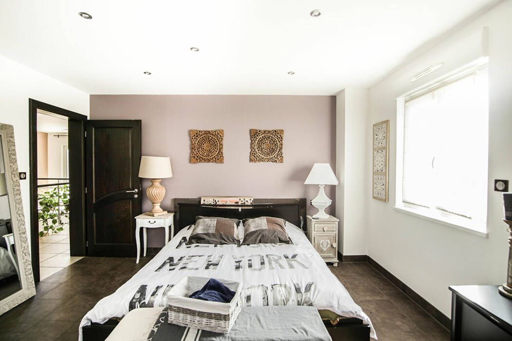 A l'étage, le confort se poursuit avec trois grandes chambres, un spacieux dressing de 14 m² pouvant faire office de quatrième chambre, ainsi qu'une grande salle de bains de près de 20 m², équipée d'une baignoire, d'une douche à l'italienne, d'un meuble double vasque et de WC séparés.
