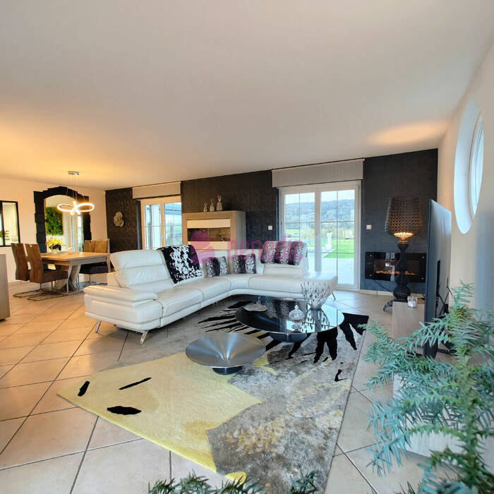 Érigée sur un magnifique terrain en fin d'impasse, celle-ci dispose d'une entrée ouverte sur un grand séjour cuisine, donnant sur la véranda, la terrasse panoramique avec son store motorisé,